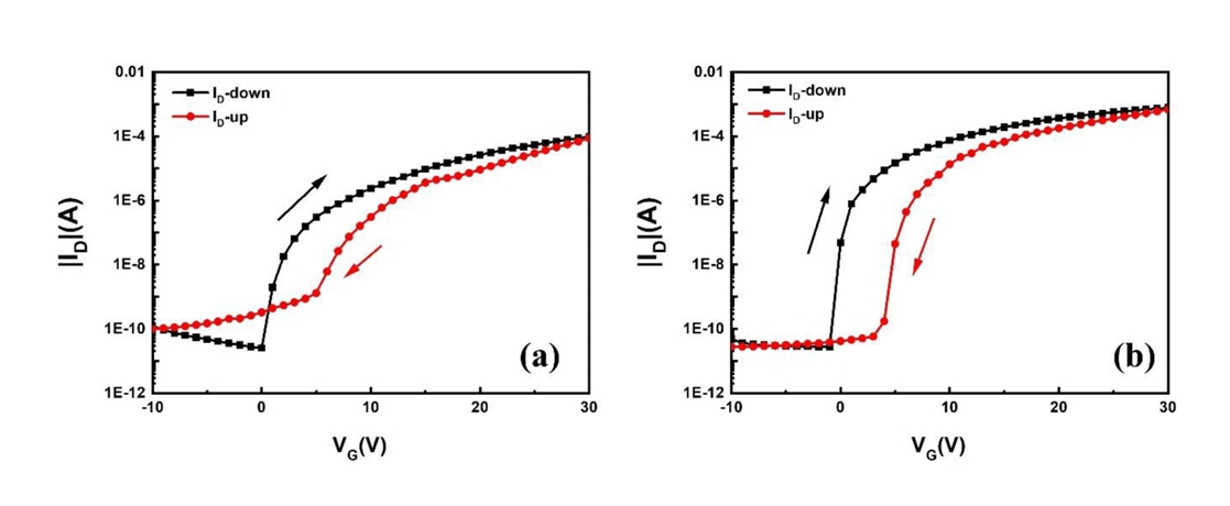 As shown in Fig 9, a clockwise hysteresis was observed in the transfer curves, and the VTh shifted in the positive direction when the VG sweep direction was reversed. Although pulsed UV-assisted thermal annealing enhanced