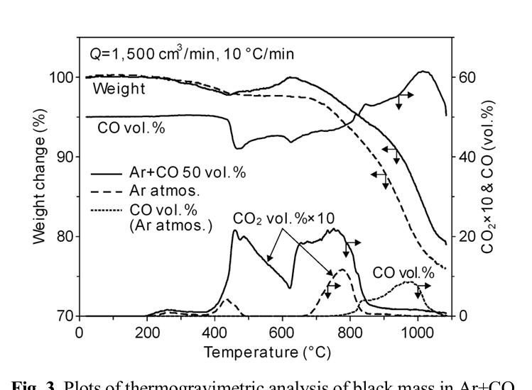 본 연구는 폐LIBs에서 Li을 우선적으로 회수한 후 유가 금속과 C의 분리·회수를 위한 기초연구로, C이 다량 함유된 black mass를 CO