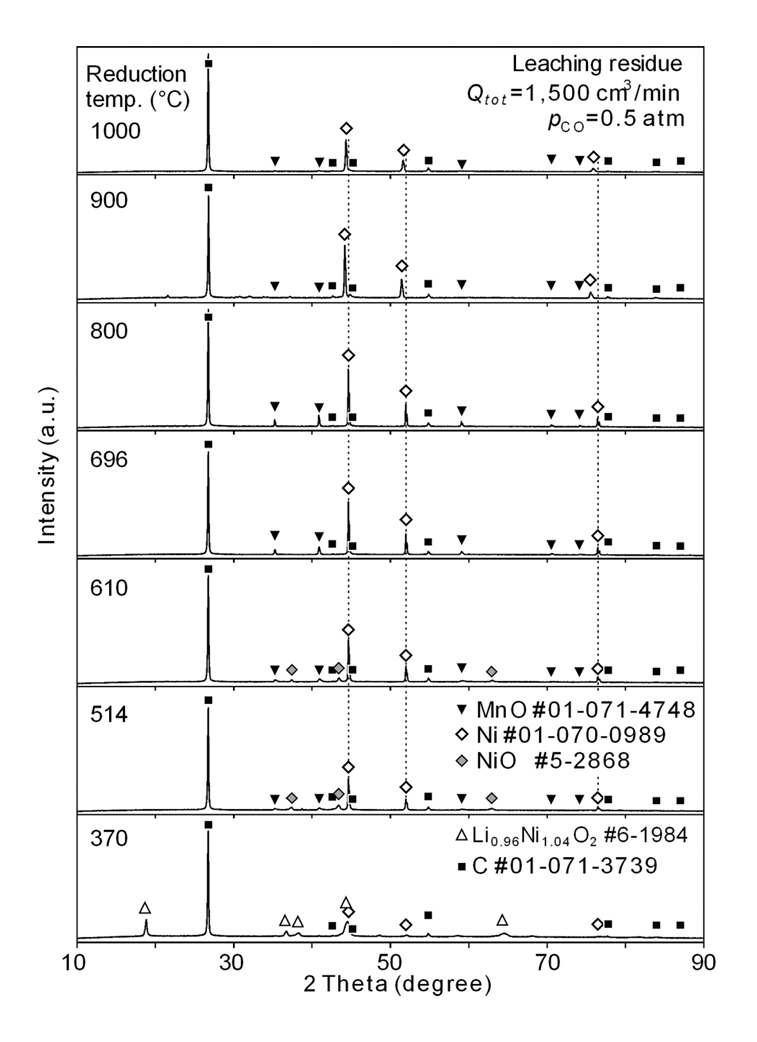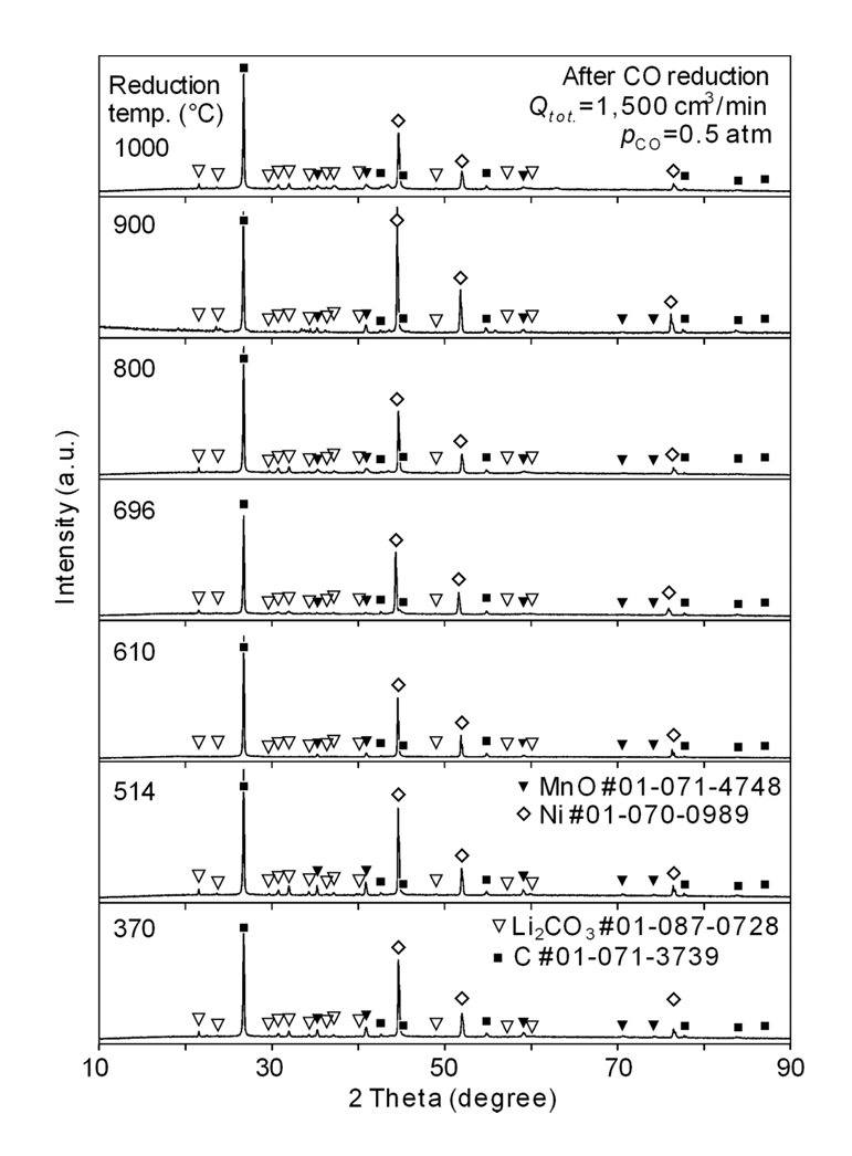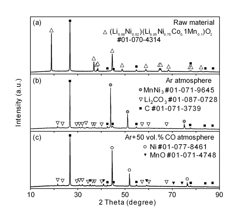 Li2CO3가 검출되었으며, 696 °C 이상에서는 Ni, Co 산화물의 대부분이 환원되었고, 900 °C 이상에서는 MnO의 일부도 환원되어 Ni-Co 합금에