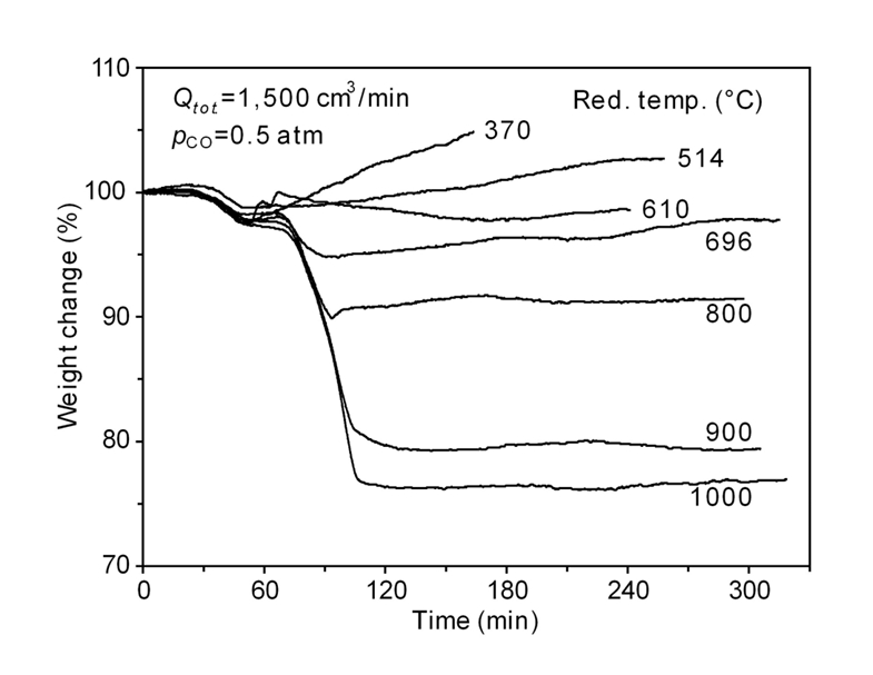 환원 온도 상승에 따라 CO 가스 송입 전후에 급격히 무게가 감소하였으며, 특히 900 °C 이상에서는 초기 무게의 20 % 이상이 감소하였으나 일정