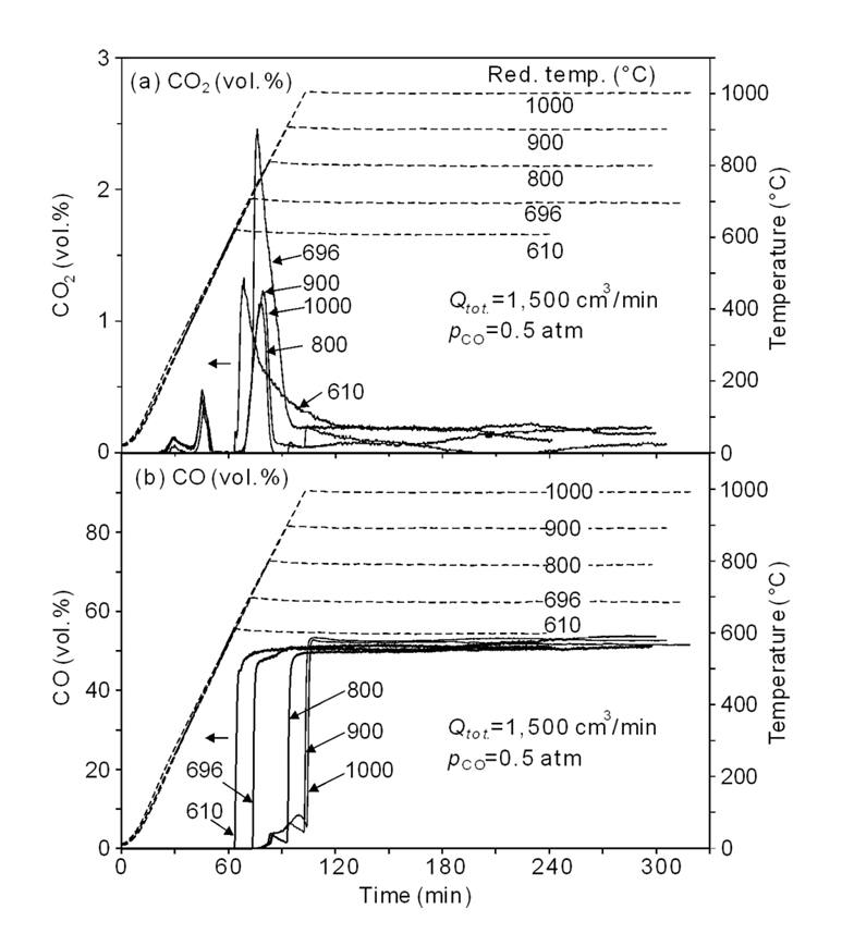 가스(Ar, Ar+50 vol.%CO)를 1,500 cm3/min로 불어 넣어 일정 시간 동안 반응시킨 후 Ar 가스 분위기 중에서 상온까지 냉각하여 시료를 회수하였다. 실험 전후 Ni 도가니의 무게 측정