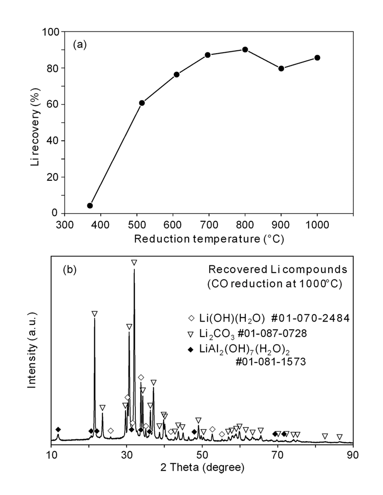 그림 9에는 환원 온도에 따른 Li 회수율(a)과 1,000 °C에서 환원한 후 수침출에 의해 회수한 여액을 농축 및 증발시켜 회수한 Li 화합물의 X-선