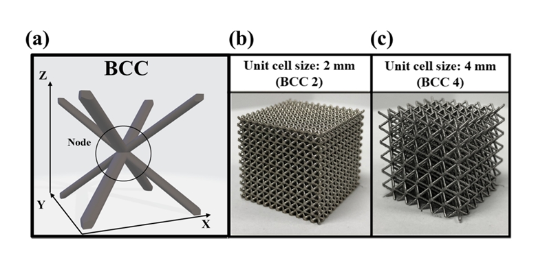 격자 구조체의 단위 셀(unit cell)은 체심 입방(BCC, body centered cubic) 형상으로 설계하였으며, 단위 셀 크기는 각각