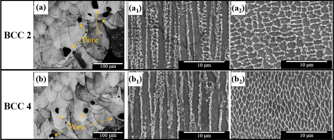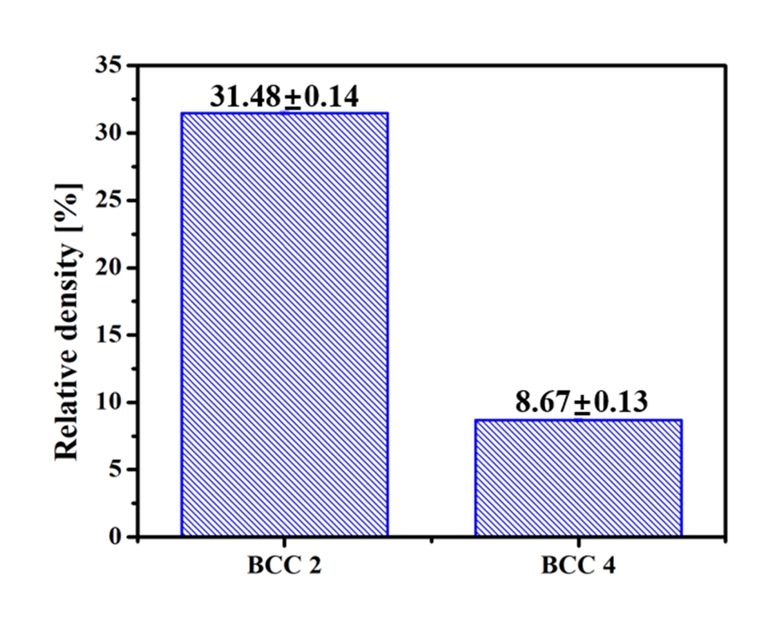 상승하게 된다. 이러한 관점에서 BCC 2는 상대 밀도가 증가하며 치밀화가 나타난 반면, BCC 4는 내부 기공 비율이 커 치밀화가 관찰되지 않은