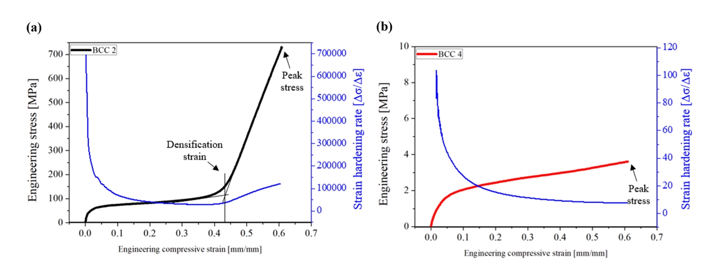 영역 이후 변형률이 약 0.43에 도달할 때까지 응력이 점진적으로 증가하다가 이후 급격히 상승하는 치밀화 구간이 뚜렷하게 나타났다. 반면 BCC 4는