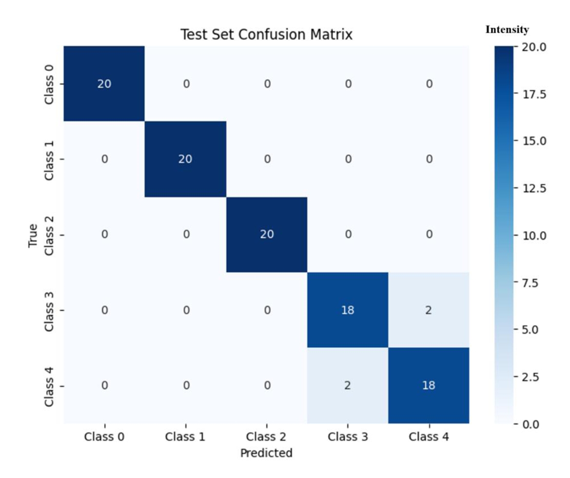 of all 20 test samples. The classification of Class 3 showed strong performance, with