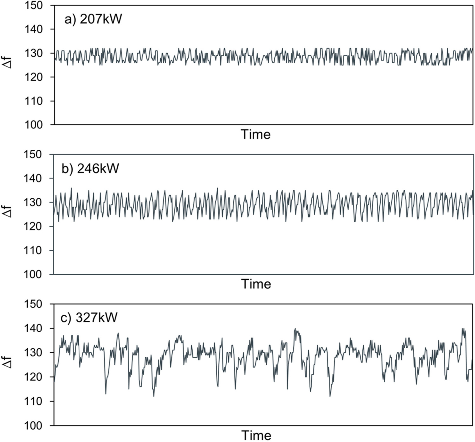 b) at intermediate heat input(246kW), c) at high heat input(327kW)