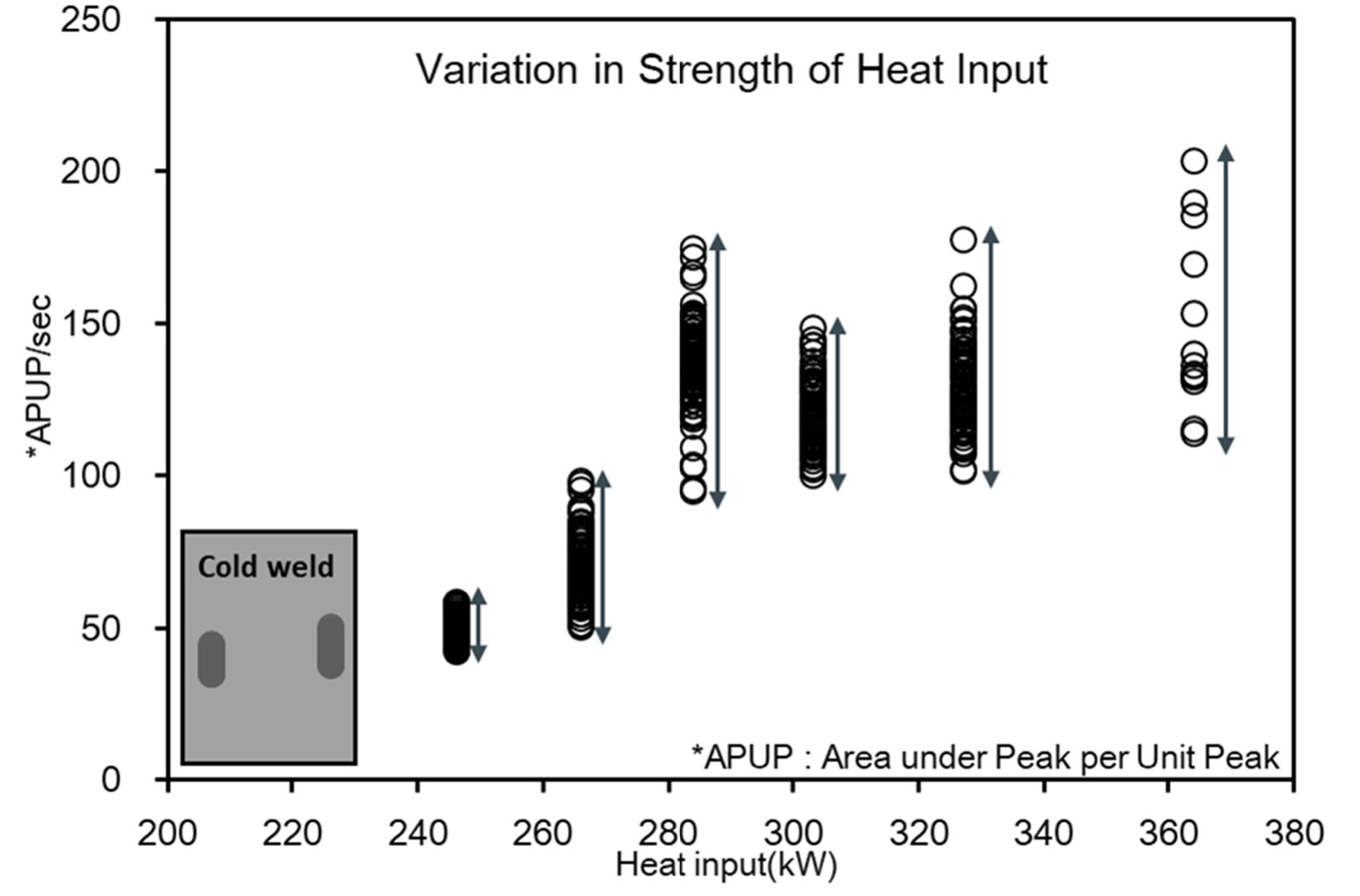 그림 12에는 동일한 용접조건에서 각 입열량에 따른 그림 11의 입열 강도를 계산하여 나타내었다. 그림에서 하나의 원은 1초 동안의 입열 강도 변화의 평균을, 화살표는 동일 용접 조건에서 입열 강도의 편차를