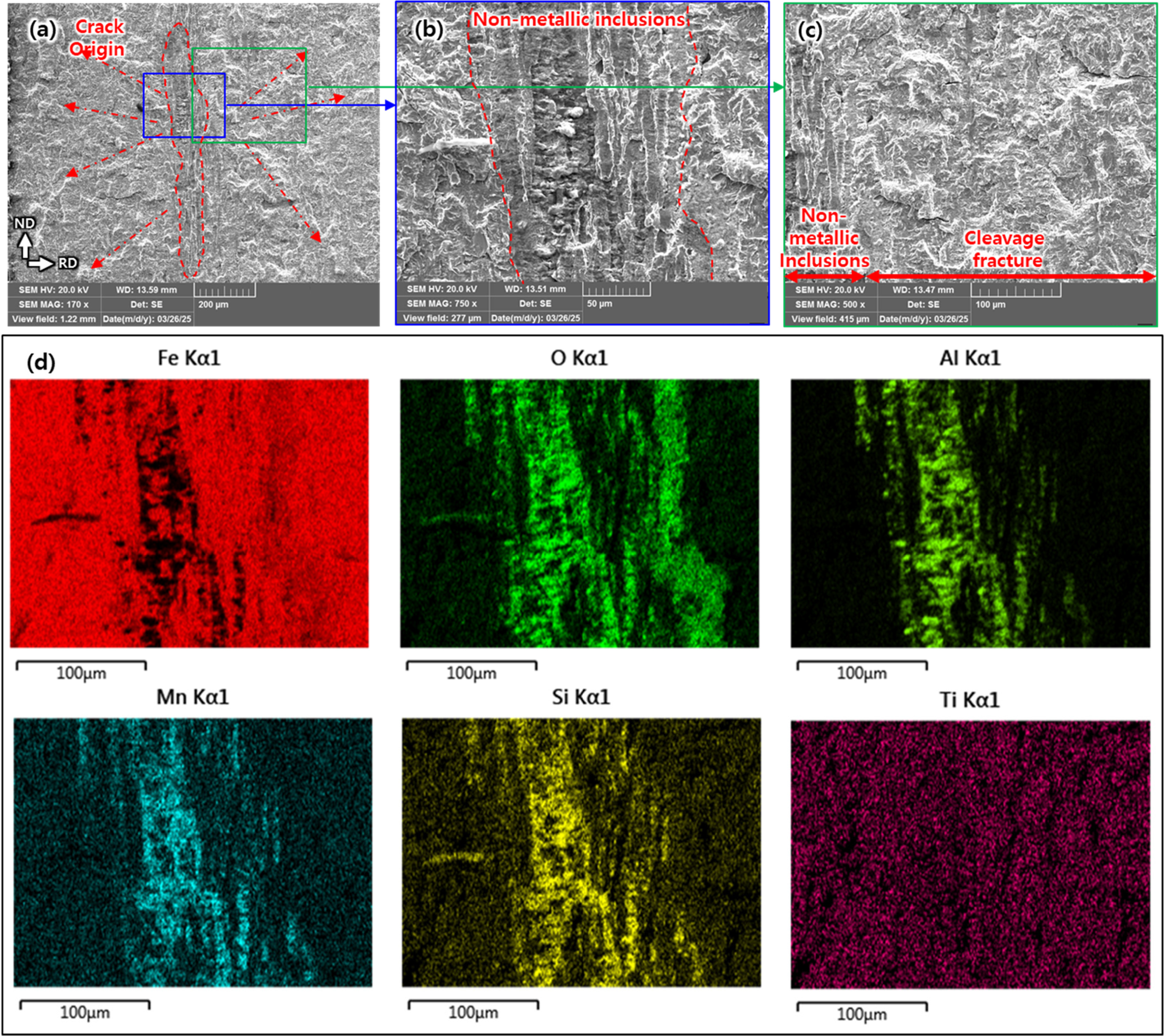 origin, (b) SEM image of welding inclusion at the crack origin, (c) SEM image on the