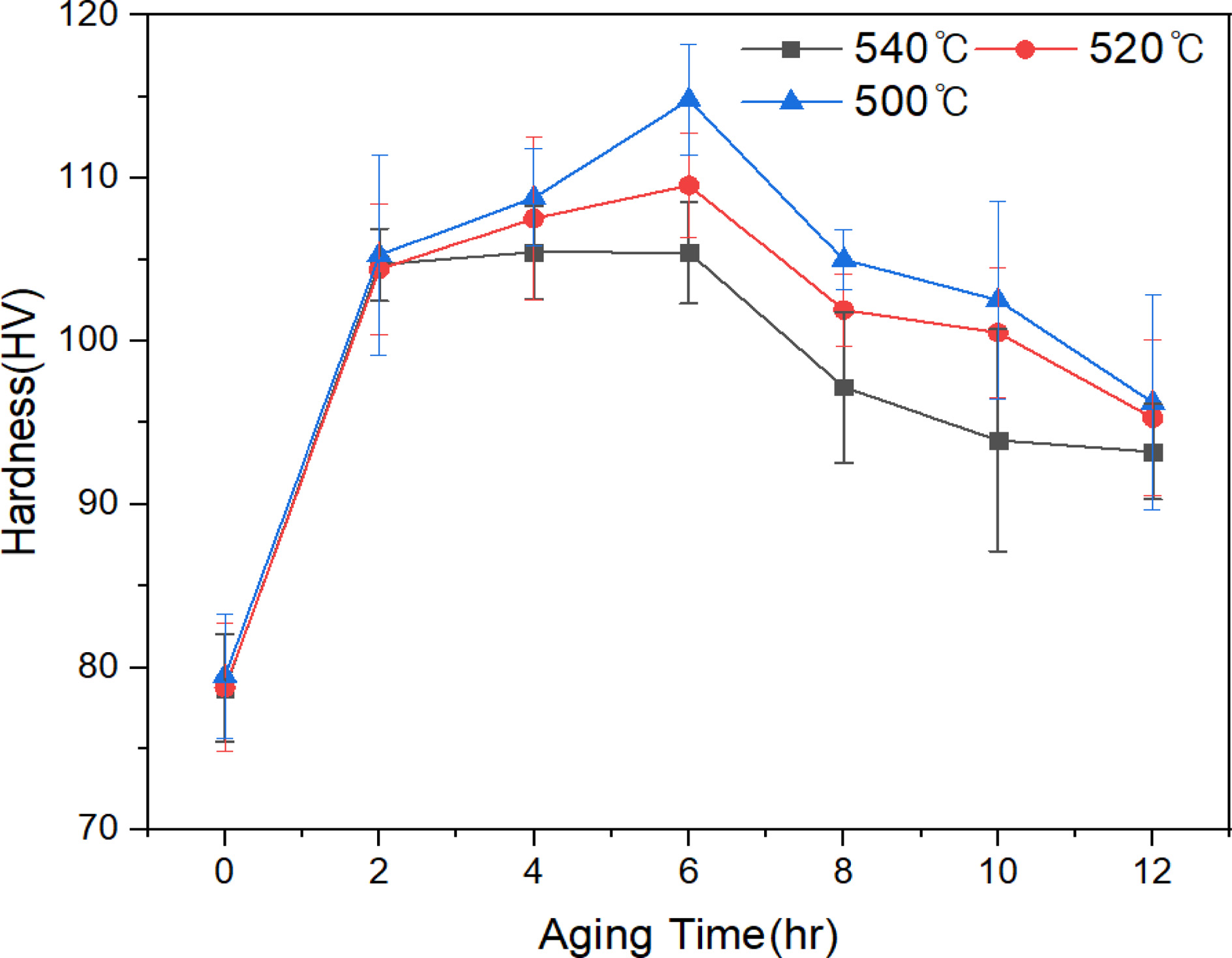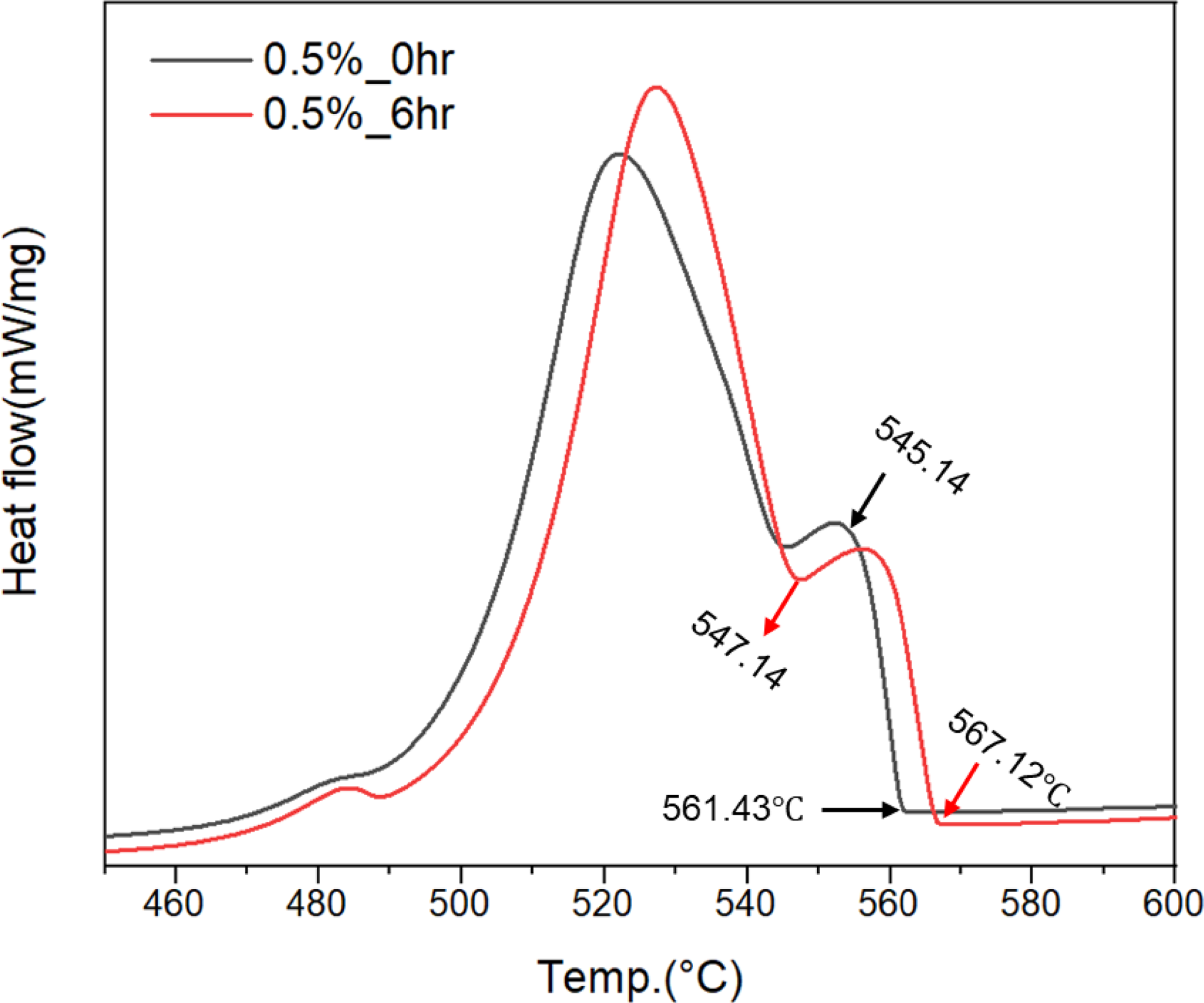 ๊ทธ๋ฆผ 3์ 500 โ์์ ์ฉ์ฒดํ ์ด์ฒ๋ฆฌ ํ ์ํจ์๊ฐ(0 hr, 6 hr)์ ๋ฐ๋ฅธ La ์ฒจ๊ฐ์ ๋ฌด(0 wt.%, 0.5 wt.%)๋ณ ๊ฒฝ๋ ๋ณํ๋ฅผ ๋ํ๋ธ ๊ฒฐ๊ณผ์ด๋ค.