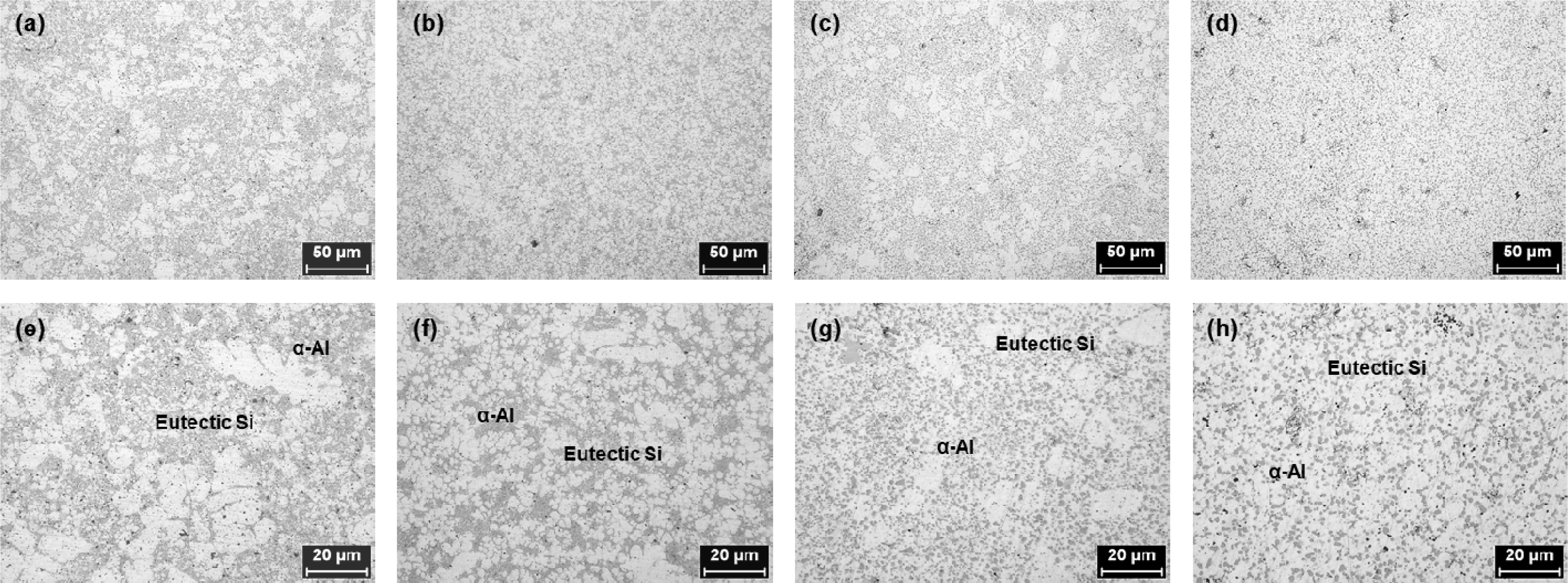 c, e, g)๋ ๋น๊ต ์ ฮฑ-Al๊ฐ ๋ถ๊ท ์ผํ ํํ๋ก ๋ถํฌ๋์๋ ํํ์ ์กฐ์ง์ด ๊ด์ฐฐ๋์์ผ๋, ์ด์ฒ๋ฆฌ๋ฅผ ์ํํ ์ํธ(b, d, f, h)๋ ๊ท ์ผํ ํํ์