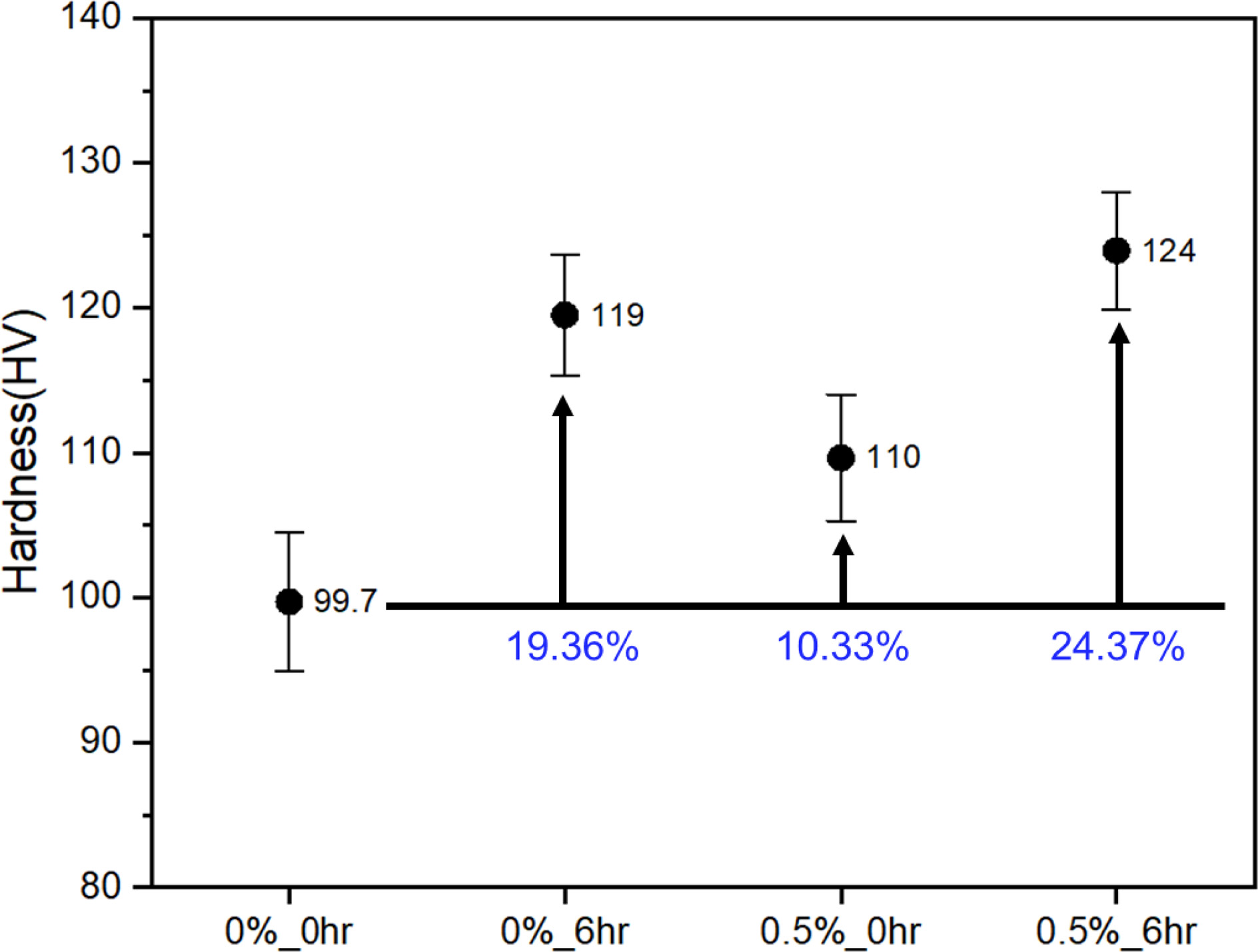 La์ ์ฒจ๊ฐํ์ง ์์ ํฉ๊ธ์ ๊ฒฝ์ฐ, ์ํจ ์ด์ฒ๋ฆฌ๋ฅผ ์ํํ์ง ์์ ์ํธ(0%_0 hr)์ ํ๊ท ๊ฒฝ๋๋ 99.7 HV๋ก ๋ถ์๋์์ผ๋ฉฐ, 6hr ์ํจ ์ด์ฒ๋ฆฌ