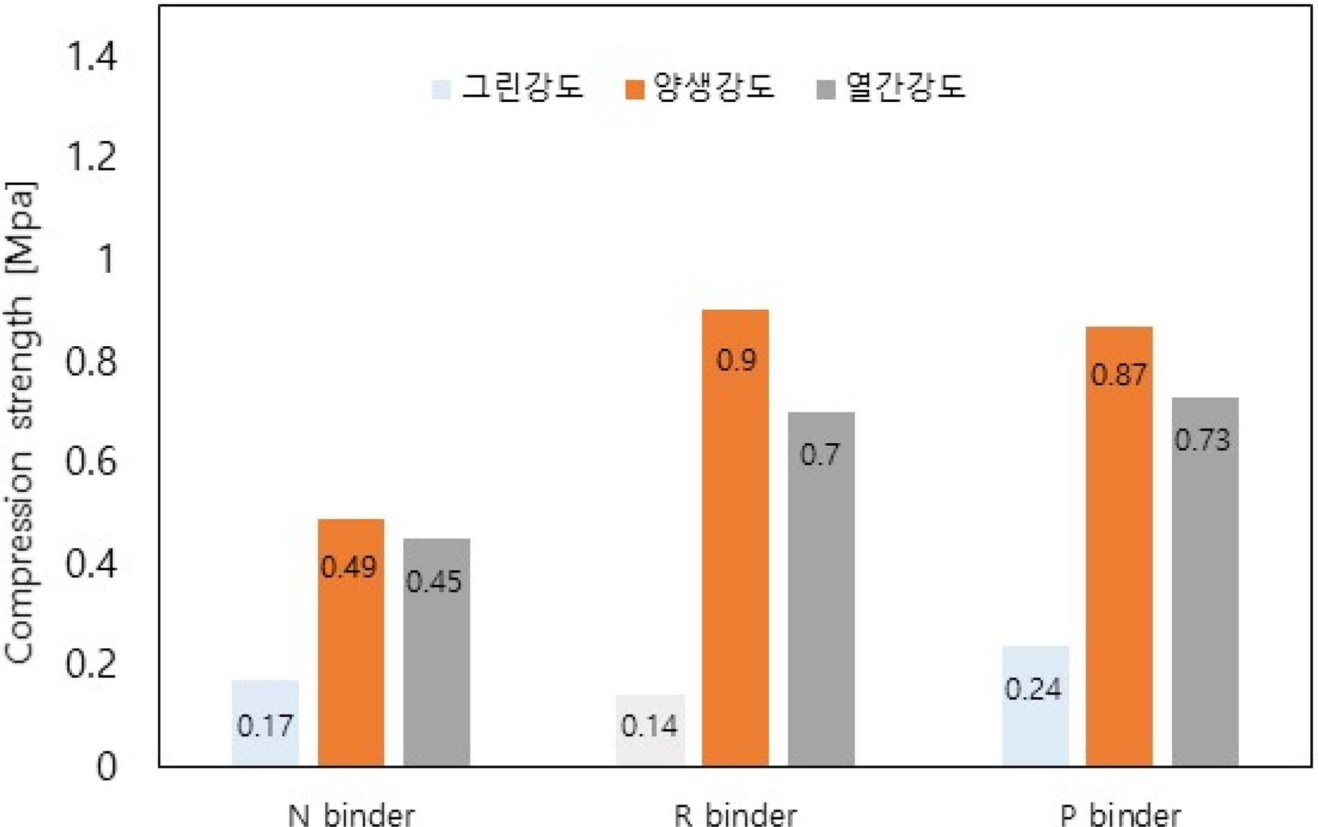 P ๋ฐ์ธ๋๊ฐ 0.87 Mpa๋ก N ๋ฐ์ธ๋์ ๋นํด ์ฝ 1.8~2๋ฐฐ ๋๊ฒ ํ์ธ๋์๋ค. R ๋ฐ์ธ๋์ ๊ฒฝ์ฐ Si-O-Na ๊ฒฐํฉ์ ํ์ฑ์ผ๋ก ํ์โ์ถํฉ ๋ฐ์์ด