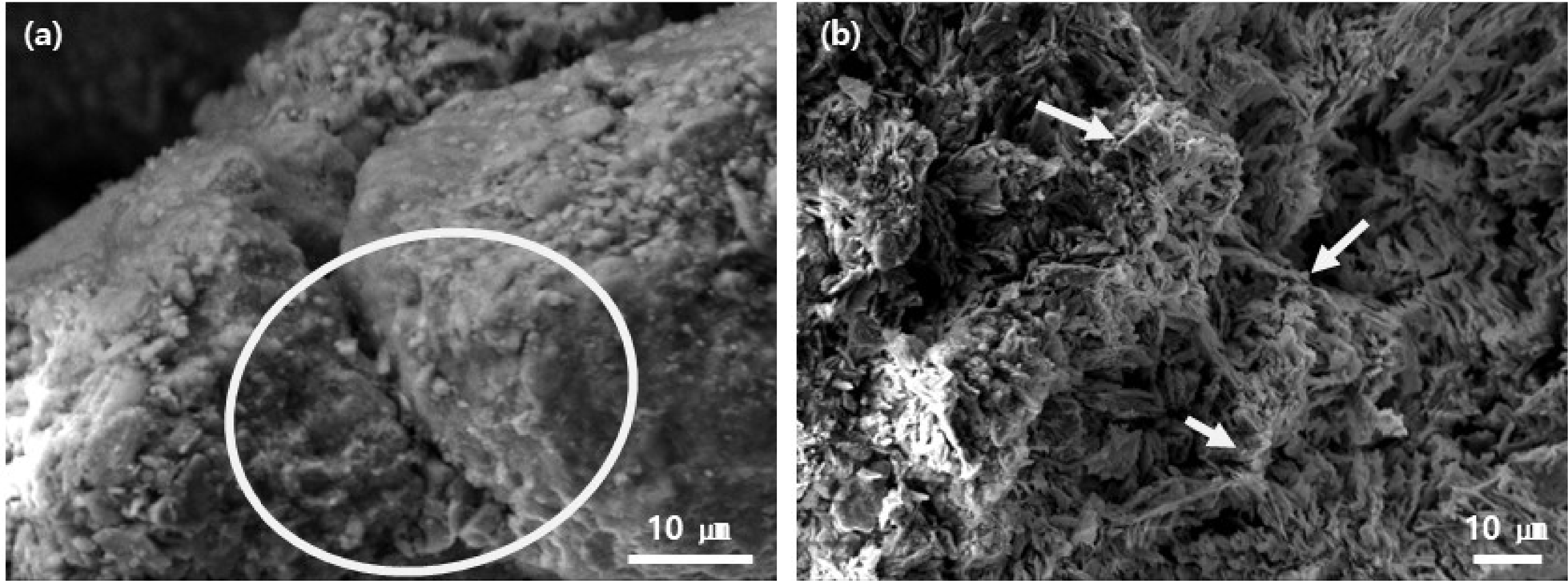 Fig. 7. SEM micrographs of briquettes prepared with P binder at a curing temperature