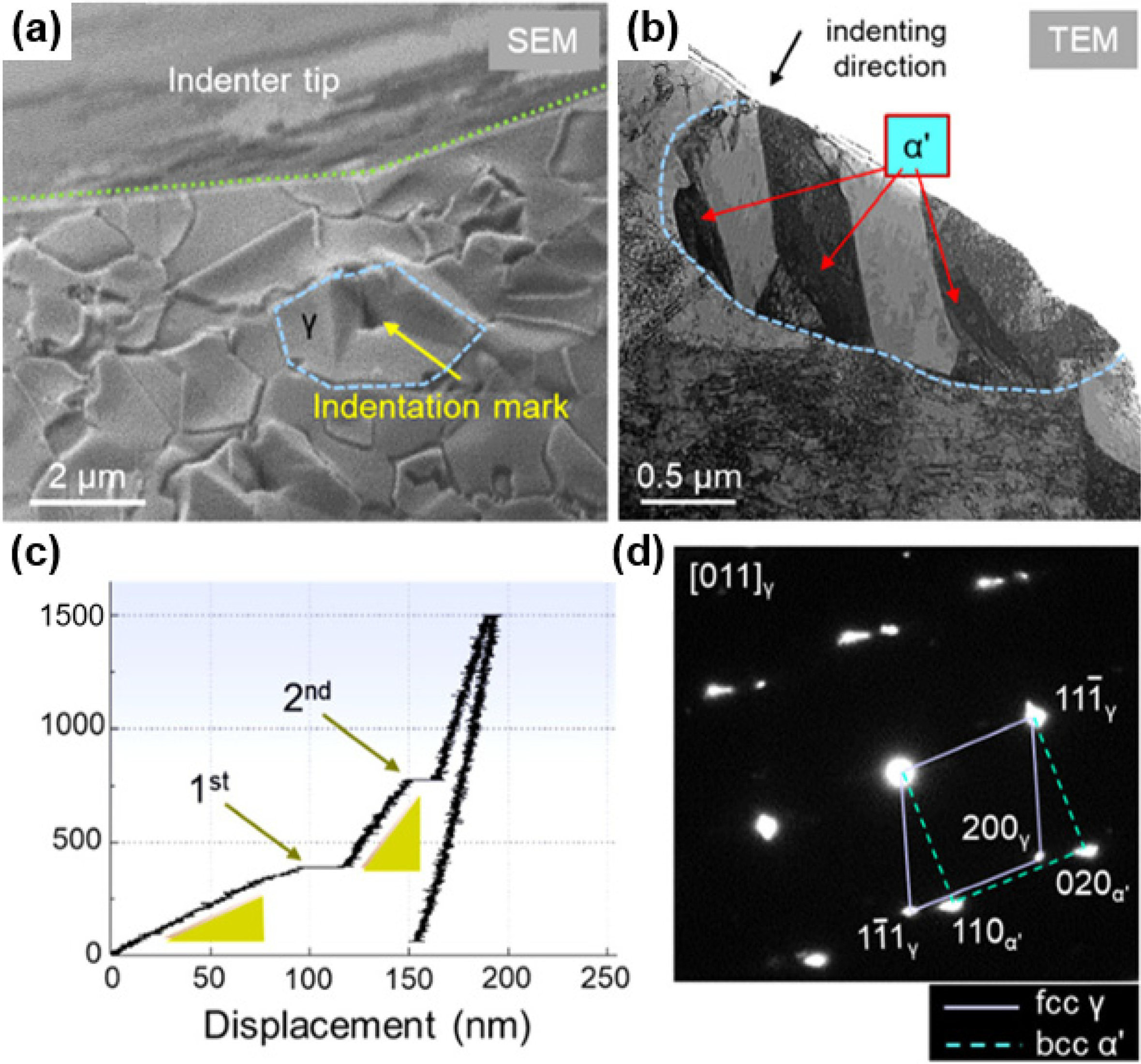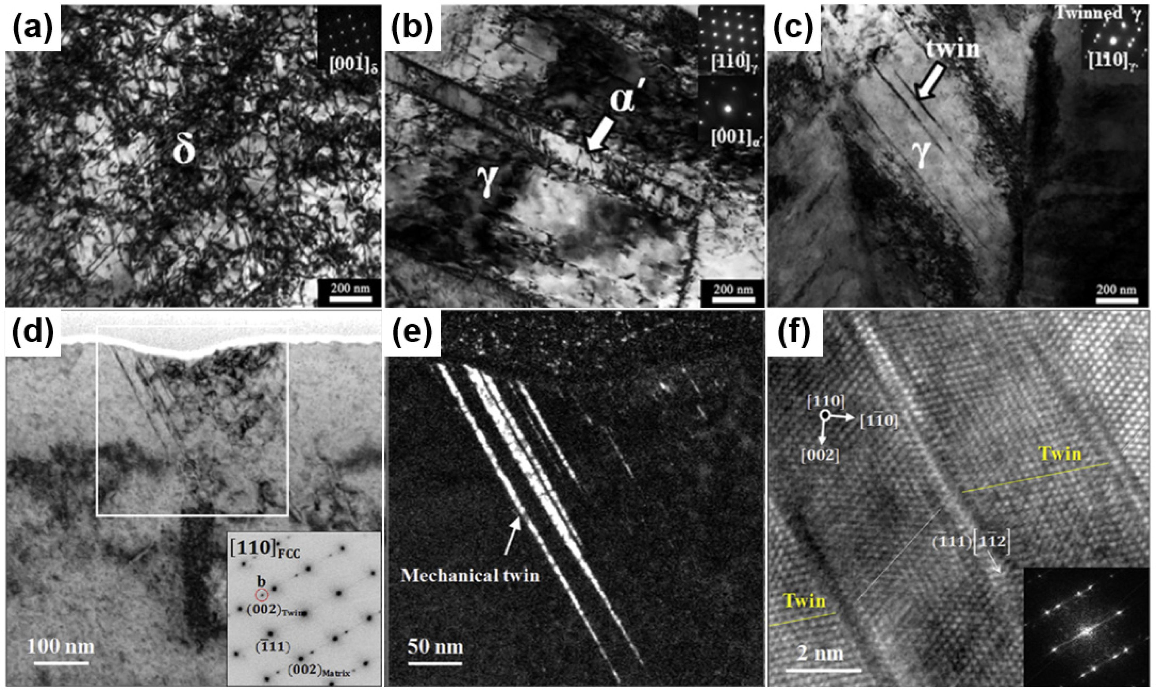 (b) α‘-martensite formed along twins and grain boundaries by plastic deformation[38].