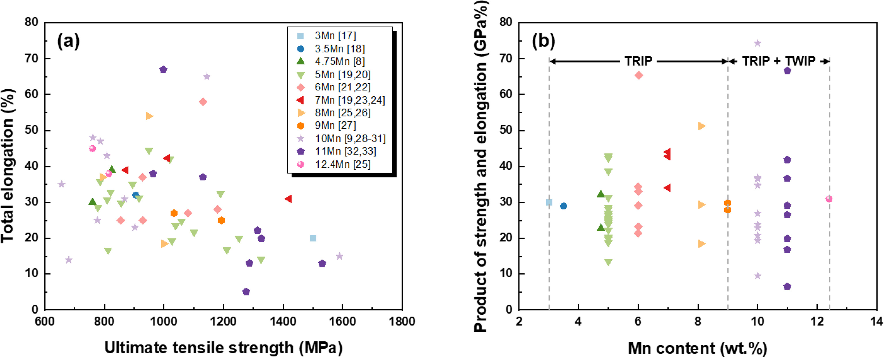 TRIP 메커니즘은 특히 자동차 산업에서 높은 강도와 연성이 필요한 부품에 광범위하게 사용되고 있으며, 중망간강의 경우 3-10 wt.%의 망간을