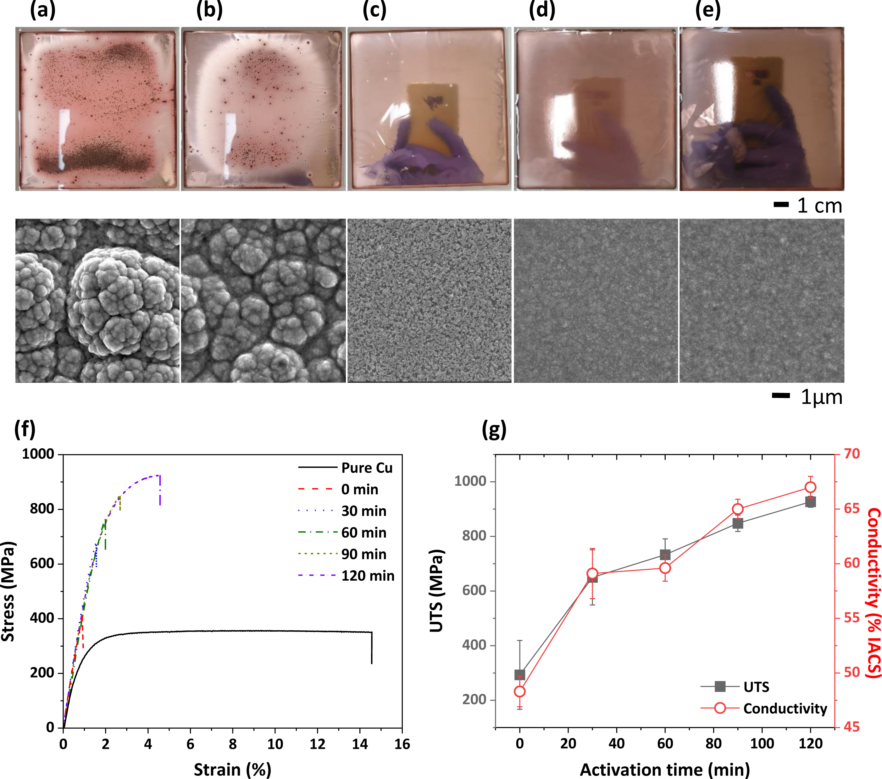 120 min (Fig. 1(e)) at 50 mA/cm2. As shown in Figs. 2(f) and (g), both the strength and conductivity of the CuAg foil gradually improve through electrolytic