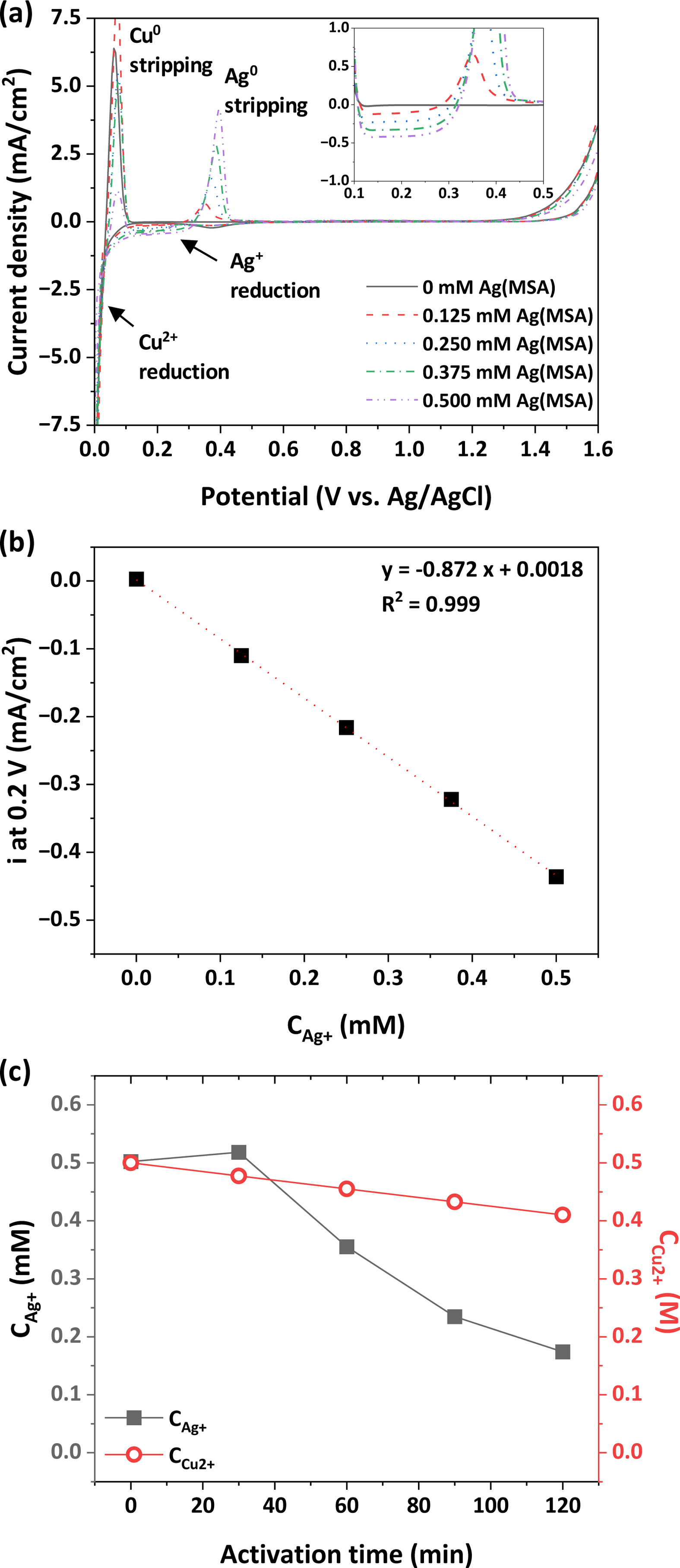 a magnified image of (a) between 0.1 and 0.5 V. (b) Limiting current density for Ag+ reduction (with current density at 0.2 V) depending on Ag+ concentration. (c) Changes in Ag+ and Cu2+ concentration during activation.