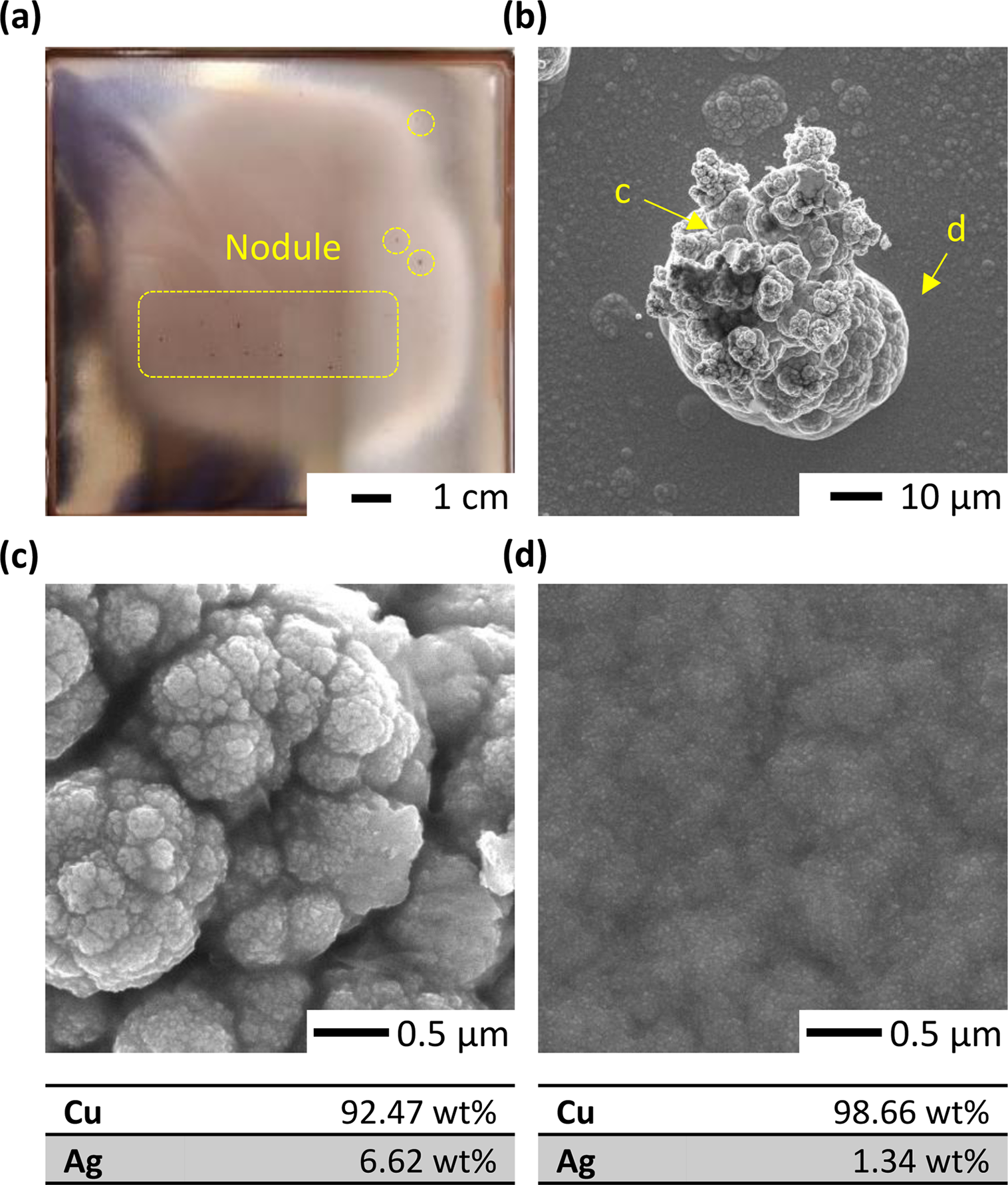 M Cu(MSA)2, 0.17 mM Ag(MSA), and 1.0 M MSA. (c, d) Magnified images for (c) nodule and (d) flat