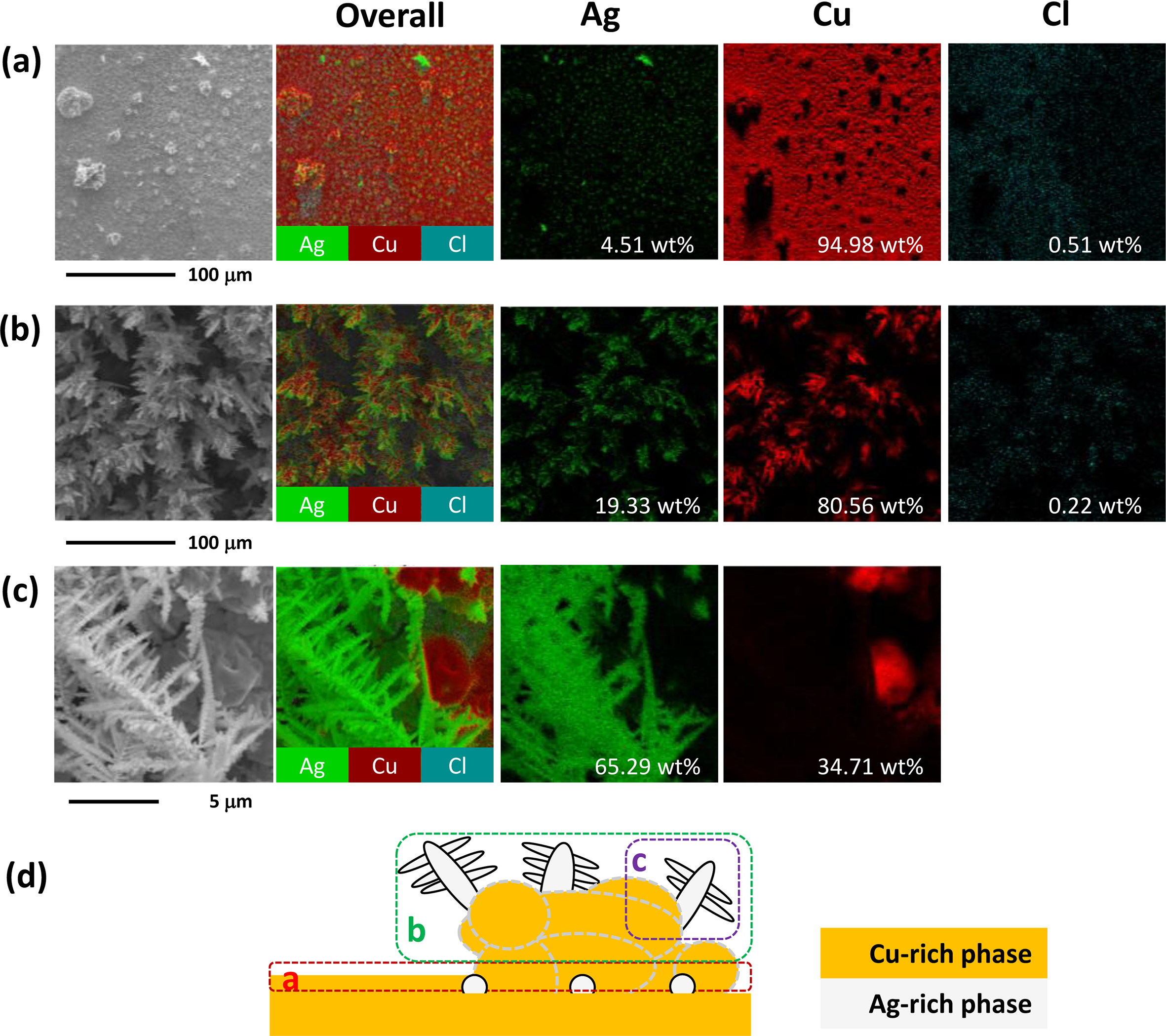 the growth front of the nodule (details in Fig. 6(d)). The EDS results for the region underneath the nodule (Fig. 6(a)) and the nodule (Fig. 6(b)) show Cl contents of 0.51 wt% and 0.22 wt%, respectively, indicative of Cl- impurity in the solution. The EDS results also show that the Ag-rich phase nucleates