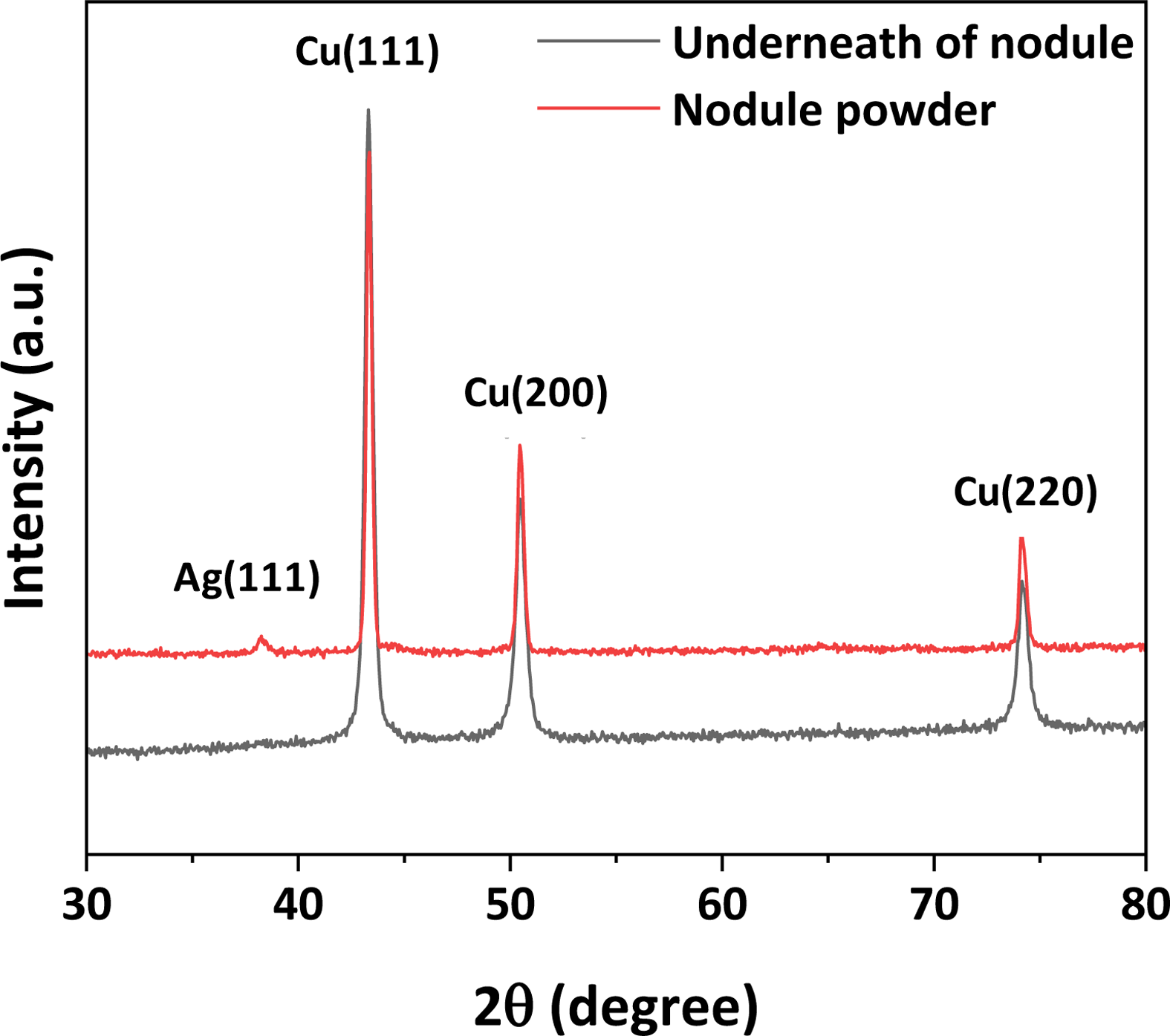Meanwhile, the XRD results for the nodule additionally show an Ag(111) peak at 38.2°,