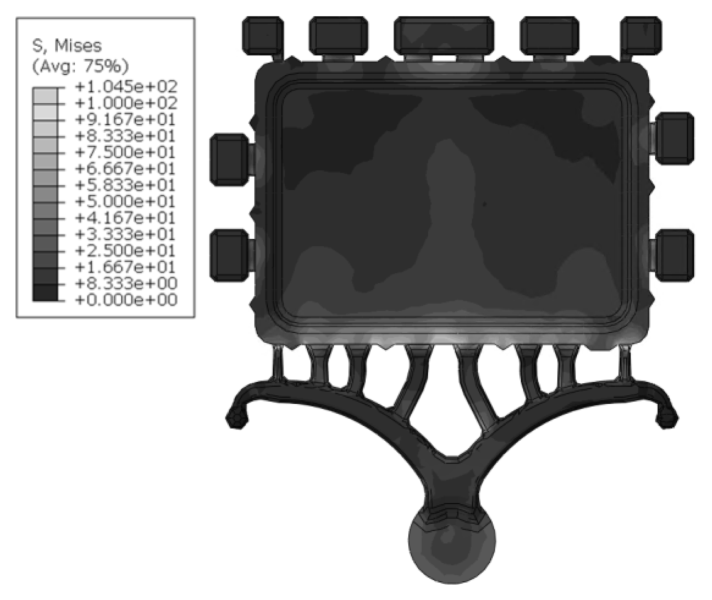 제품의 잔류응력 검토결과 게이트 주변부에서 최대응력이 발생하였으며, 잔류응력의 수치는 122.8 MPa로 나타났다. 표 6에 ADC12의 기계적 물성치를 나타내었으며, 항복강도인 152.0 MPa 이하로 나타나 문제가 없을 것으로 평가되었다[13].