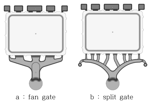 고압 다이캐스팅 주조방안에 따른 충진 유동 특성을 비교·분석하고 최종적인 방안을 선정하기 위해 그림 6에 두 가지 상이한 게이트 설계를 갖는 러너 시스템의 모식도를 나타내었다. 방안 a는 fan gate 구조로, 용탕이 비교적 넓은 게이트 폭을 통해