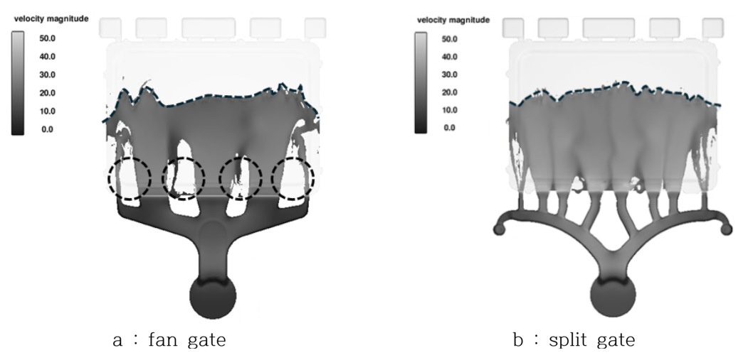 유입되도록 설계된 방식이며, 방안 b는 split gate 구조로, 다수의 분기된 게이트를 통해 용탕이 분산 유입되도록 구성된 방식으로 충진 거동을