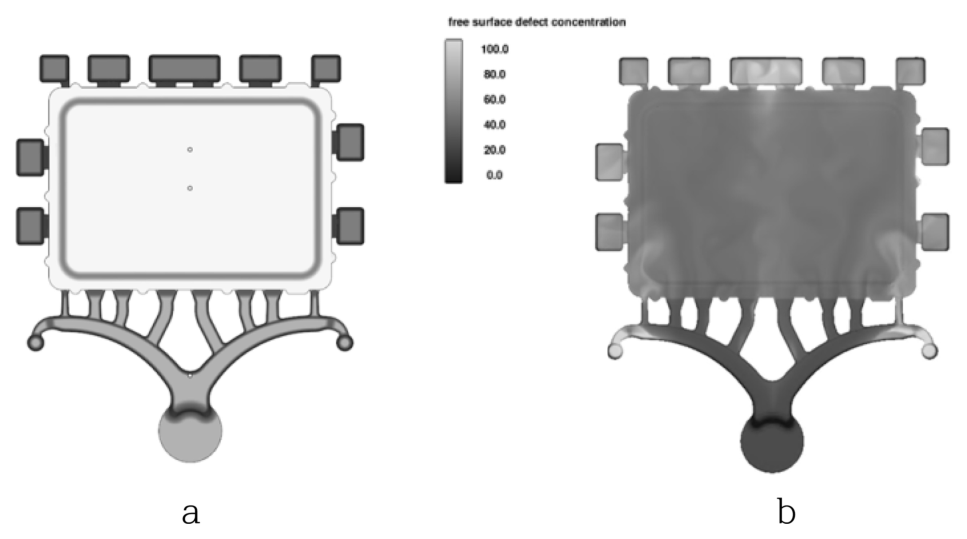 얇은 박판의 경우, 충진되는 용탕 높이의 균일성에 따라 성형성이 우수한 것으로 보고되고 있으며[12], 유동해석 검토 결과 fan gate 방안은 게이트 주변부에 말탕이 발생하고 균일하게 충진되지 않는 것으로 나타났다. 그림 7과 같이 상대적으로 split gate 방안의 용탕 높이 균일성이 높고 그림 8과 같이 산화물 분포에서도 양호한 결과가 나타나 split gate 방안을 선정하였다. 그러나 split gate 방안에서는 제품의 측벽부에 고농도의