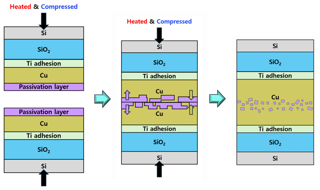 오염물 없이 구현할 수 있다는 장점이 있다[9]. 이 방식은 Cu가 부동태막을 가로질러 확산한 뒤, 반대편에서 확산된 Cu와 상호 결합하여 공통 결정 격자를 형성함으로써 강력한 접합을 이룬다.