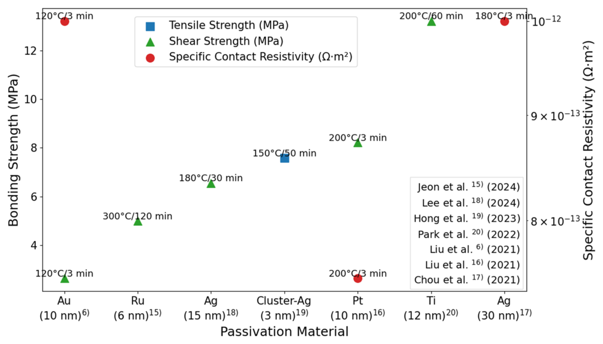 정리하여 시각화한 것이다. 이를 통하여 부동태막의 재료와 공정 변수에 따라 Cu-Cu 접합 강도와 접촉 저항이 크게 달라짐을 확인할 수 있으며, 특히