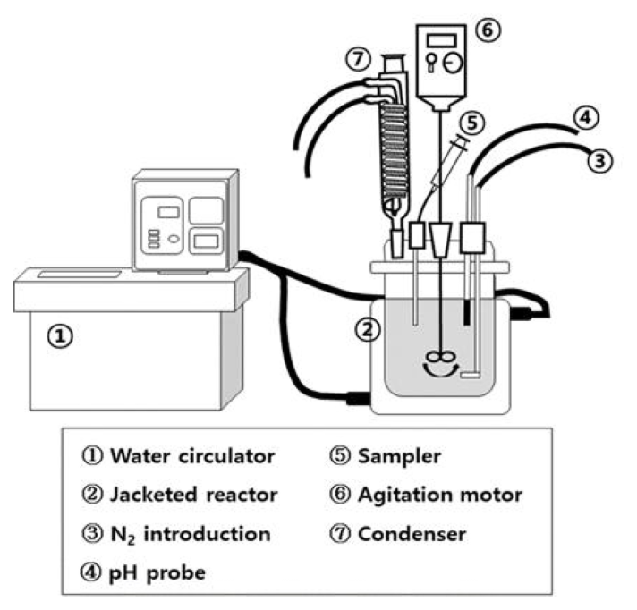 속도로 투입하면서 반응기에 연결된 항온조 (Jeio-tech, Co. Ltd., CW-10G)로 온도를 85 °C로 유지하였다. 질소가스 투입과 85