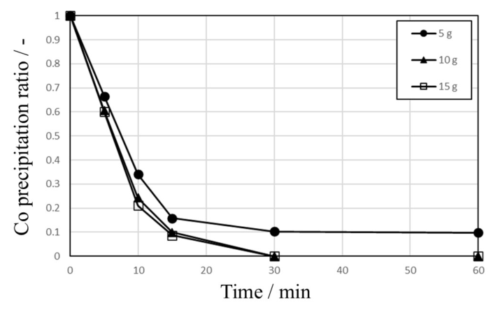 5 g, 10 g, 15 g으로 하여 코발트 세멘테이션 실험을 진행하고 실험결과를 그림 5에 나타내었다.