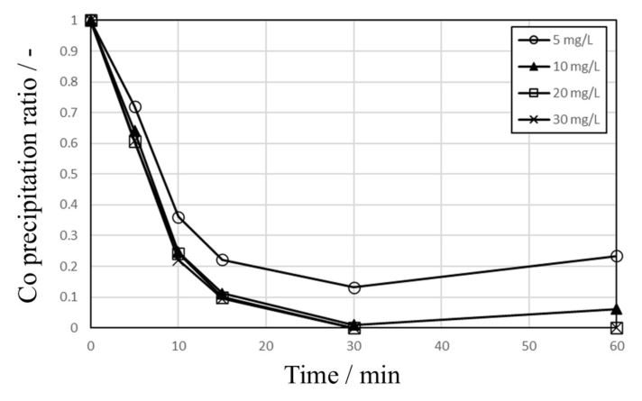 Fig. 5. Precipitation behavior of Co during cementation tests with 10 g of Zn powder