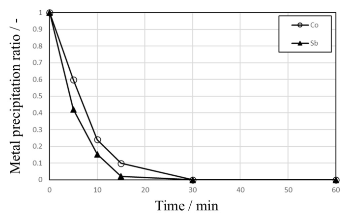 Fig. 7. Precipitation behaviors of Co and Sb during cementation tests with 10 g of