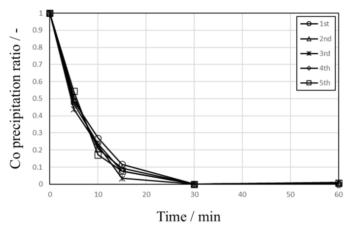 Fig. 8. Effect of repeated use of activated carbon as an activator on the Co precipitation