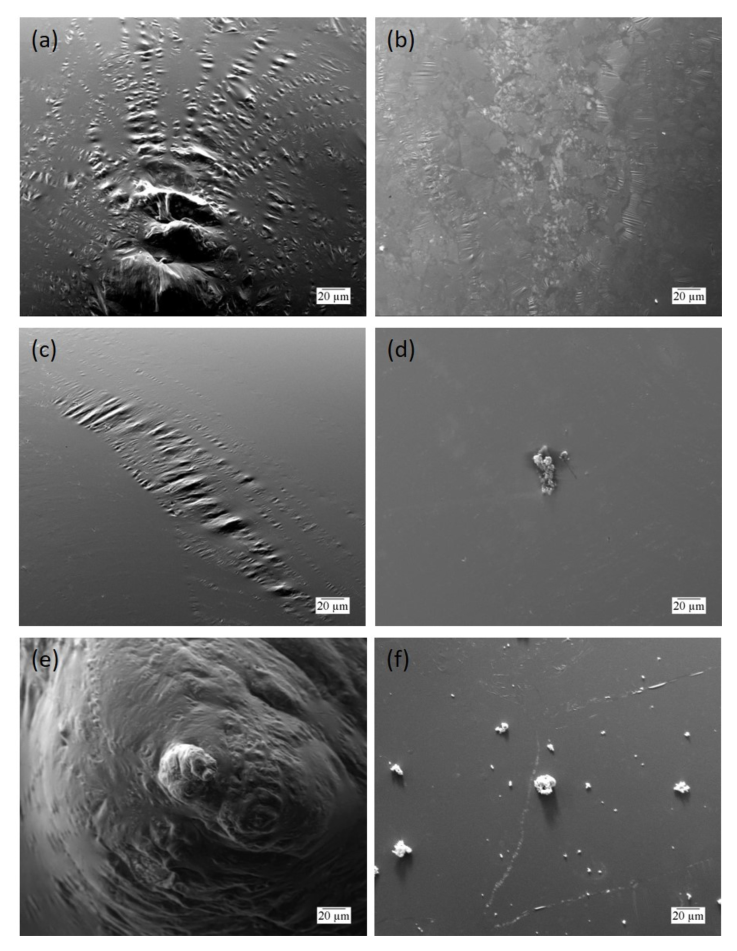 The images in Figure 6 show that the oxide presence seems to manifest in three mechanisms. In Figure 6.d and f, solid particles are seen on the surface. Figure 6.a and e show a large-scale structure, which is the remnant of the transfer needle