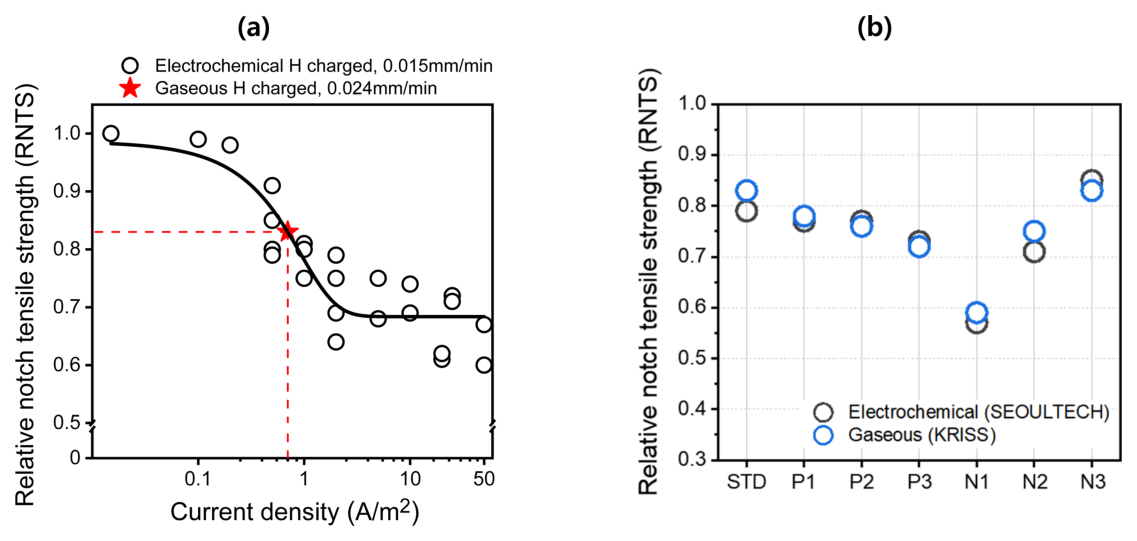 추가적인 강도 저하가 제한됨을 시사한다. 또한 특정한 전류밀도 조건에서 고압 기체 수소 주입 결과와 비교하였을 때, 유사한 RNTS 값이 나타남을