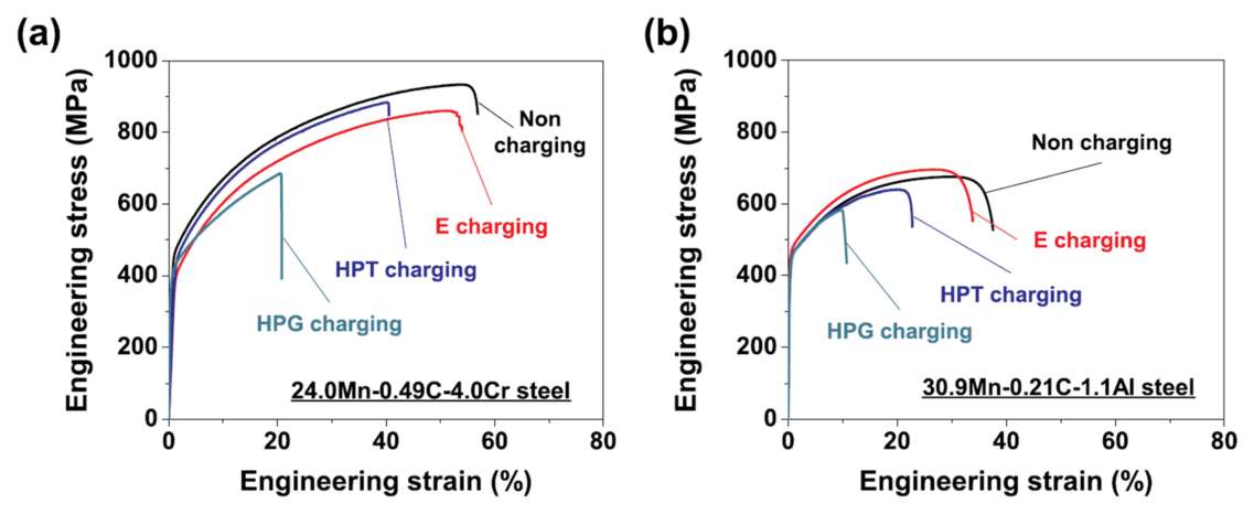 (0.015 mm/min) and comparison with gaseous hydrogen charging (0.024 mm/min). (b) Comparison